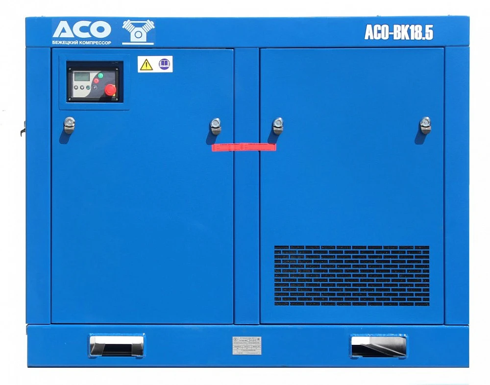 Стационарный винтовой компрессор АСО-ВК-18,5/8М2 имеет производительность 2700 л/мин и рабочее давление 8 атм. Двигатель 18,5 кВт / 380 В, винтовой блок с ременным приводом. Температура эксплуатации от 5 до 40 °С. Уровень шума не превышает 80 дБа. Габариты 127 х 91 х 99 см., масса 430 кг.