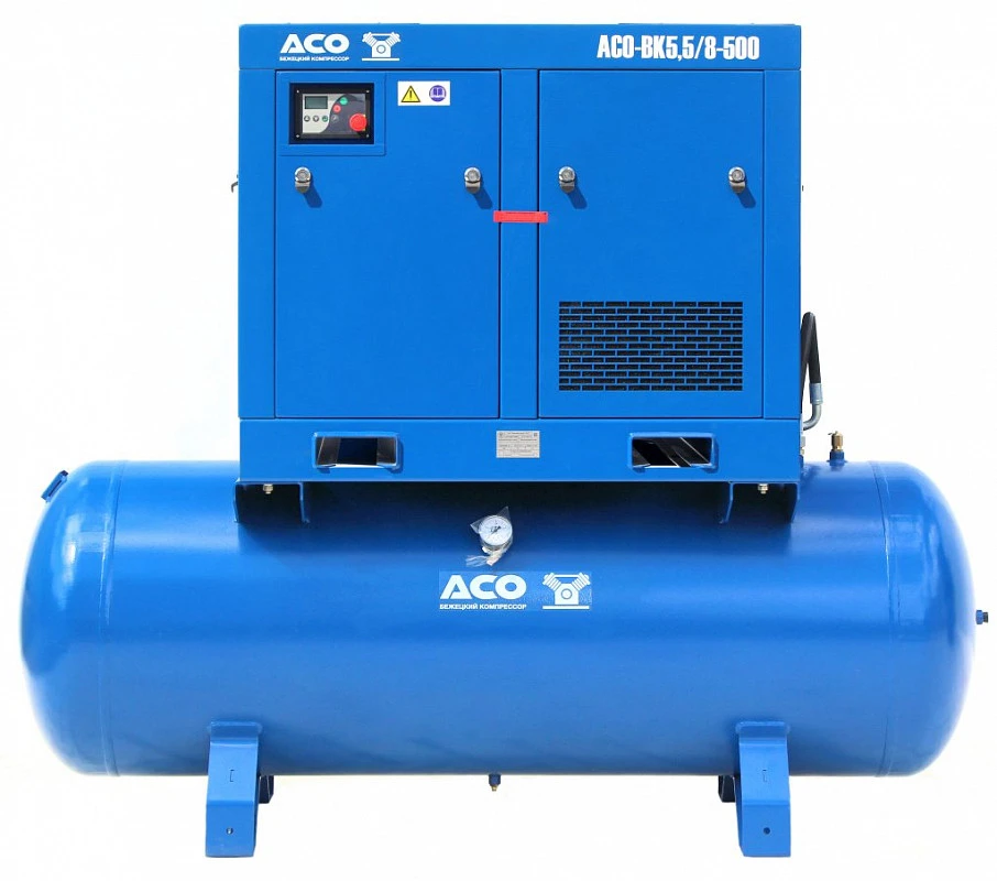 Стационарный винтовой компрессор АСО-ВК5,5М2/13-500 производительностью 600 л/мин и рабочим давлением 13 атм. Двигатель 5,5 кВт / 380 В, винтовой блок с ременным приводом. Температура эксплуатации от 5 до 40 °С. Уровень шума не более 80 дБа. Объем ресивера 500 л. Габариты 188 х 79 х 158 см., масса 385 кг.