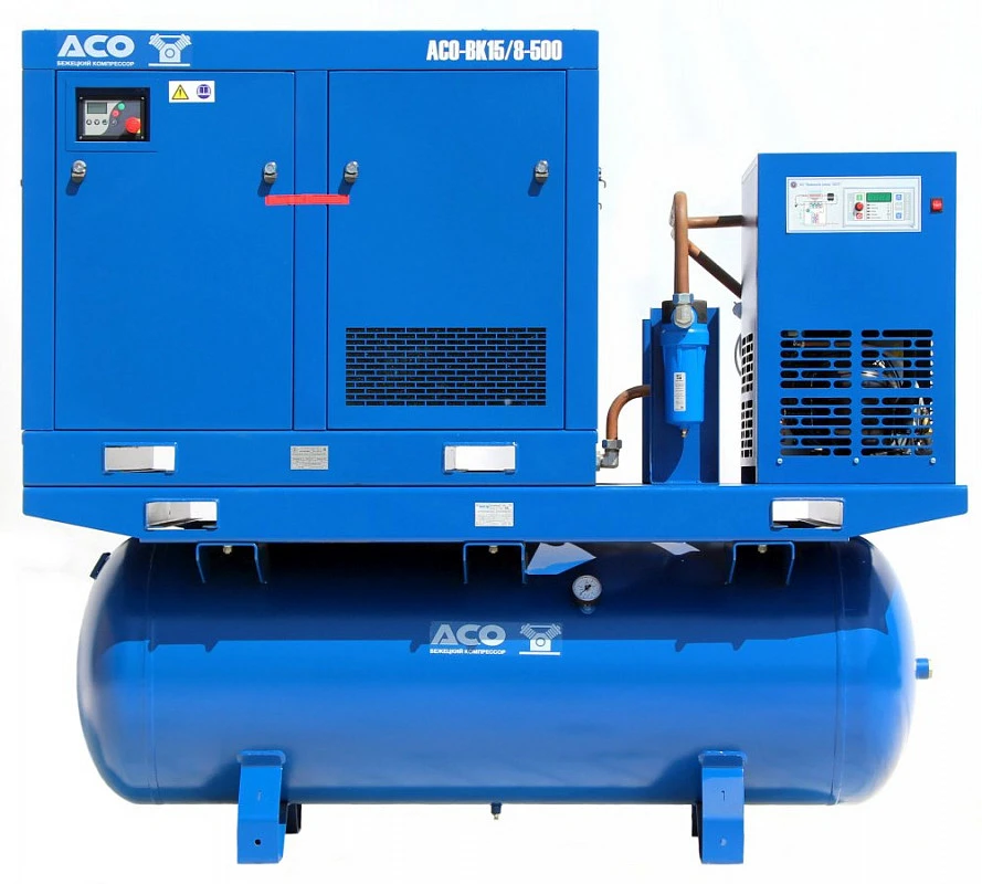 Стационарный винтовой компрессор АСО-ВК15/8М2-500 производительностью 2300 л/мин и рабочим давлением 8 атм. Двигатель 15 кВт / 380 В, винтовой блок с ременным приводом. Температура эксплуатации от 5 до 40 °С. Уровень шума не более 80 дБа. Объем ресивера 500 л. Габариты 191 х 91 х 170 см., масса 540 кг.