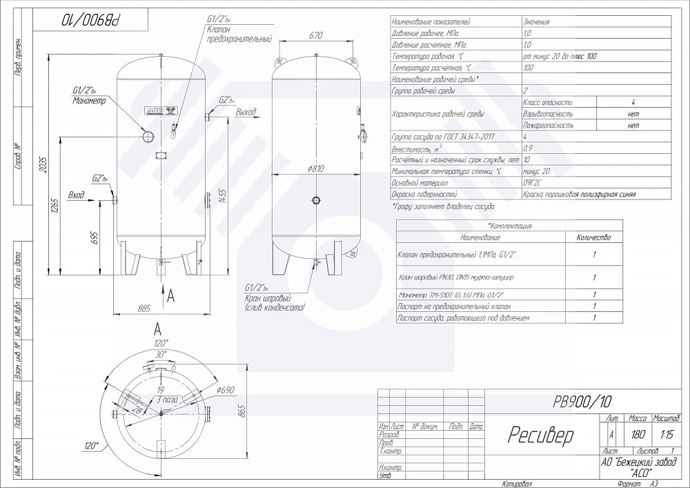 Конструкция нового воздушного ресивера РВ 900/10 разработана ведущими специалистами АСО, за плечами которых, громадный опыт в проектировании сосудов работающих под избыточным давлением. РВ 900/10 производится с применением конструкционной низколегированной стали. Новая модель оснащена одним входом и одним выходом, что является достаточным для большинства потребителей. Опоры выполнены в виде цельной конструкции, сваренной с корпусом. Корпус воздушного ресивера РВ 900/10 оснащен смотровым лючком, что является обязательным требованием российского законодательства. Для обеспечения возможности проведения технического освидетельствования, обслуживания, ремонта, контроля состояния отдельных узлов и соединений, ресивер изготавливается в строгом соответствии с ГОСТ 34347-2017. Сварка воздушных ресиверов осуществляется с применением материалов и на оборудовании ведущих мировых производителей. Ресиверы окрашиваются на автоматической итальянской линии полиэфирной порошковой краской. Каждый воздушный ресивер в процессе изготовления проходит полный комплекс обязательных испытаний и контроль качества, что гарантирует полную безопасность при эксплуатации. Все сварные соединения подвергаются контролю методом ультразвуковой дефектоскопии с целью выявления в них внутренних дефектов. Все ресиверы подвергается гидравлическому испытанию на прочность и плотность, пневматическому испытанию на герметичность. Комплектация воздушного ресивера РВ 900/10: - КЛАПАН ПРЕДОХРАНИТЕЛЬНЫЙ 1,1МПа 1/2" - МАНОМЕТР ТМ 510Т (0...1,6) МПа 1/2" - КРАН ШАРОВОЙ PN-16 1/2" (муфта-штуцер)